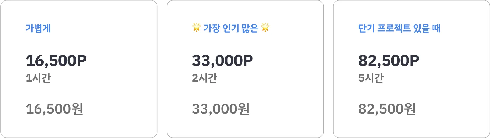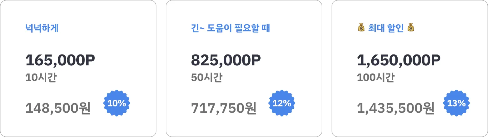1시간부터 100시간까지 시간 단위로 결제 또는 가능한 예산 / 원하는 금액만큼 자율충전할 수 있어요.