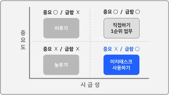 중요하지 않고, 급한 업무는 이지태스크를 통해 위임하세요. 직접 에너지를 쏟아야 할 일에 집중하면, 시간을 더 효율적으로 관리할 수 있게 될 거예요!