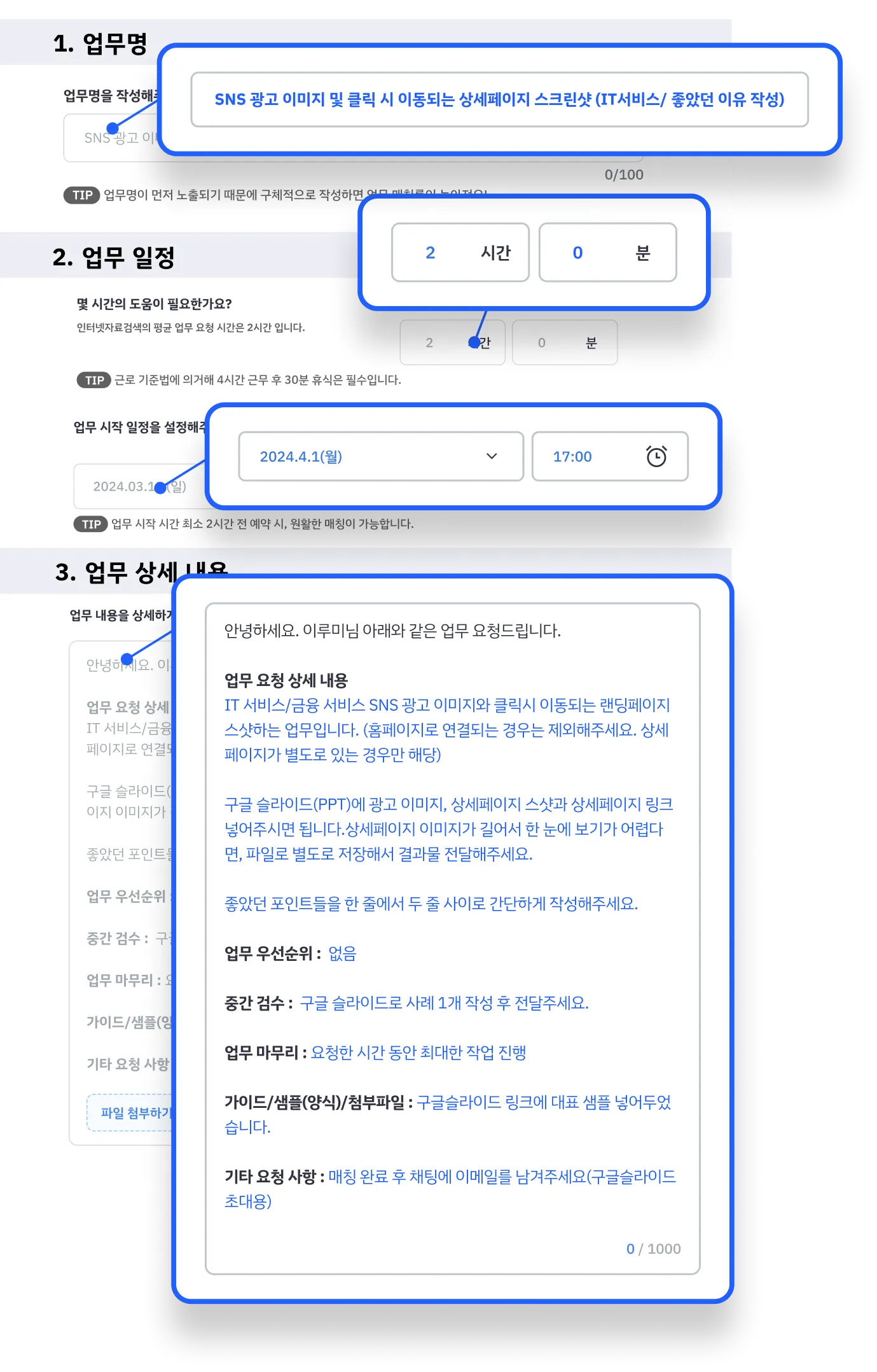 업무의 특성과 양에 맞춰 예상 업무 요청 시간을 설정해주세요.