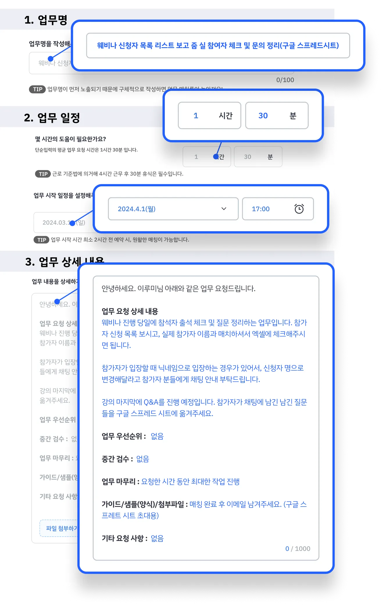 업무의 특성과 양에 맞춰 예상 업무 요청 시간을 설정해주세요.